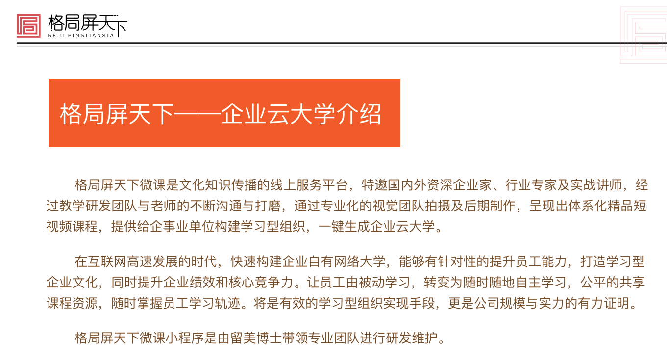 以下是关于格局屏天下----企业云大学介绍