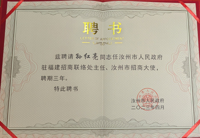 维尔斯国际控股有限公司董事长孙红亮同志被聘任为汝州市人民政府驻福建招商联络处主任、汝州市招商大使。